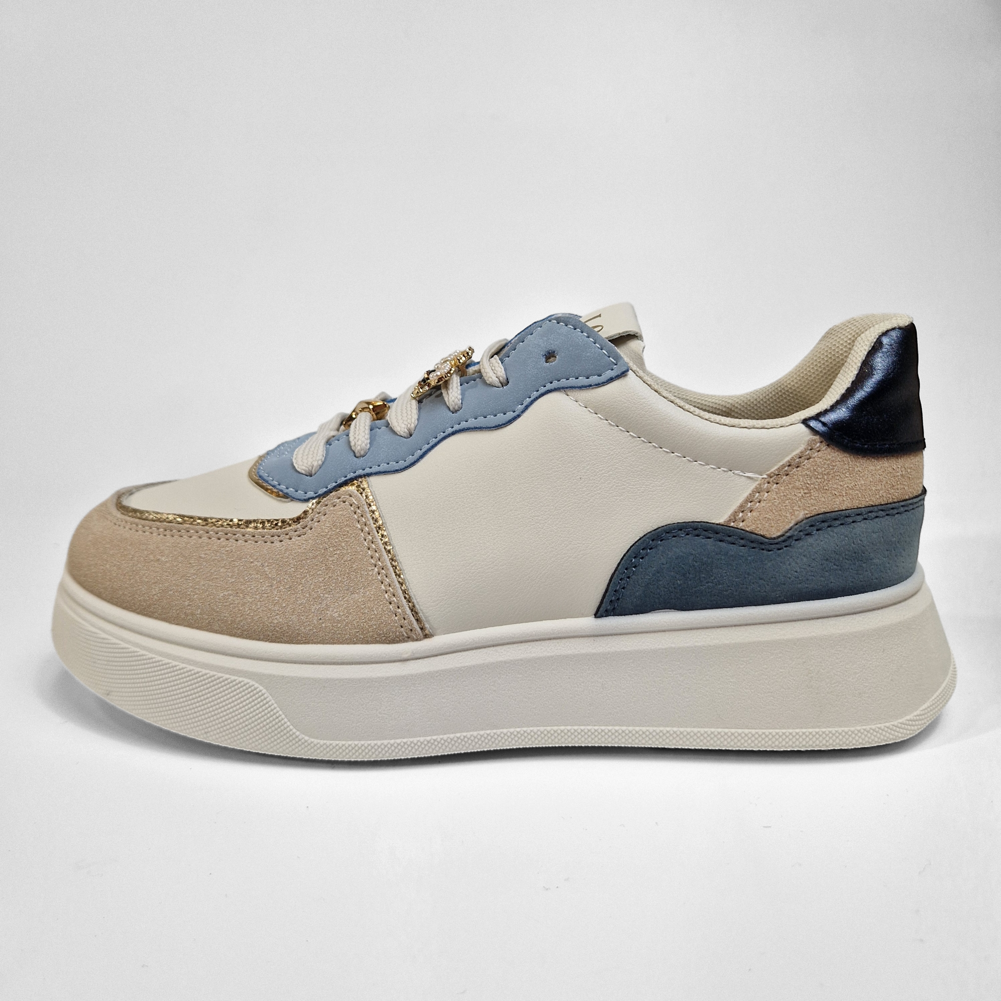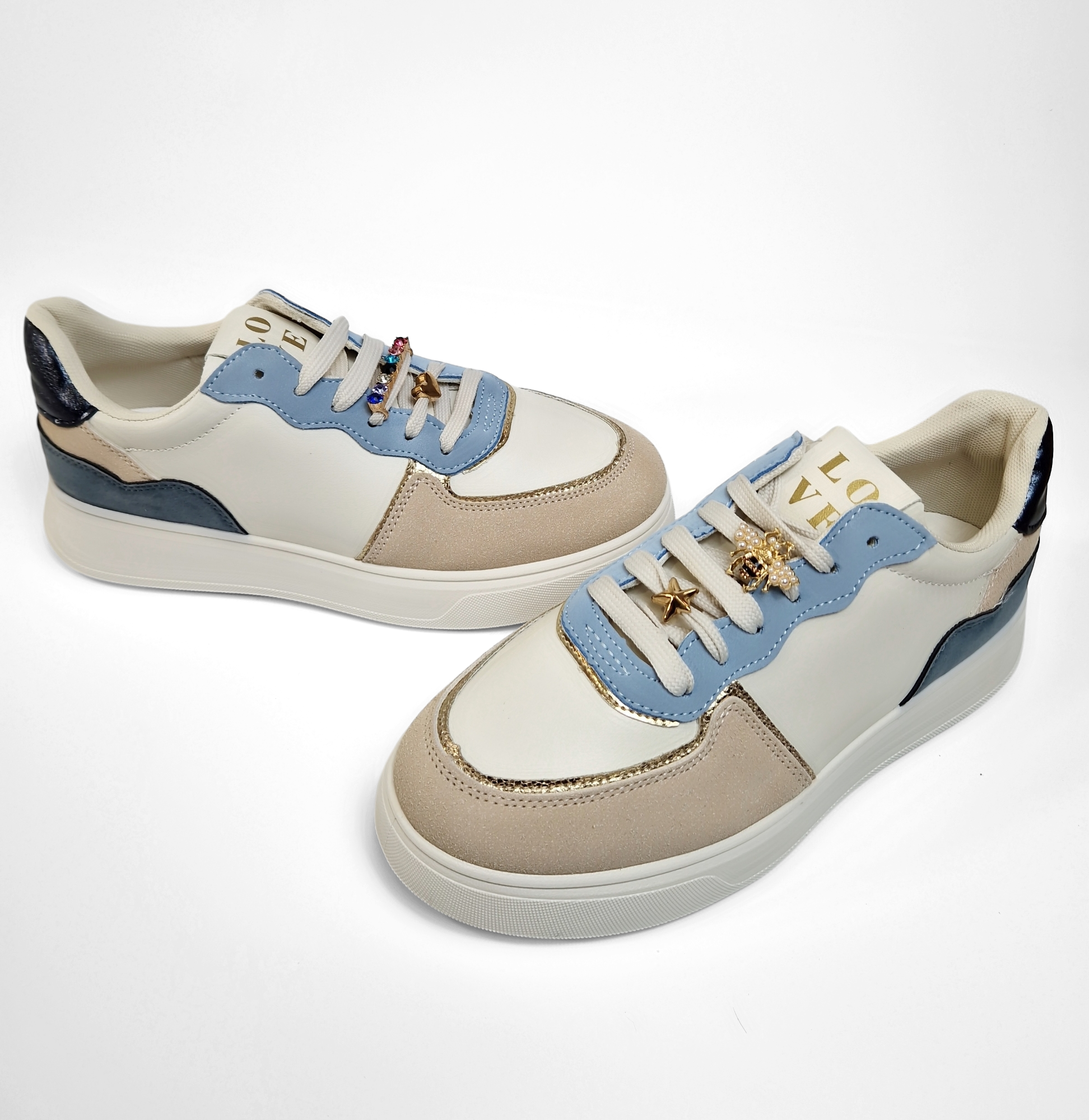 Ces baskets avec des bijoux sur les lacets sont une touche élégante et originale pour un look à la fois sportif et chic. Des couleurs comme le blanc, le bleu ou le beige, créant une base simple et moderne. Les lacets assortis à la couleur de la chaussure sont ornés de petits bijoux amovibles, ajoutant une dimension sophistiquée et féminine à la chaussure. Ces accessoires scintillants apportent une touche de glamour.