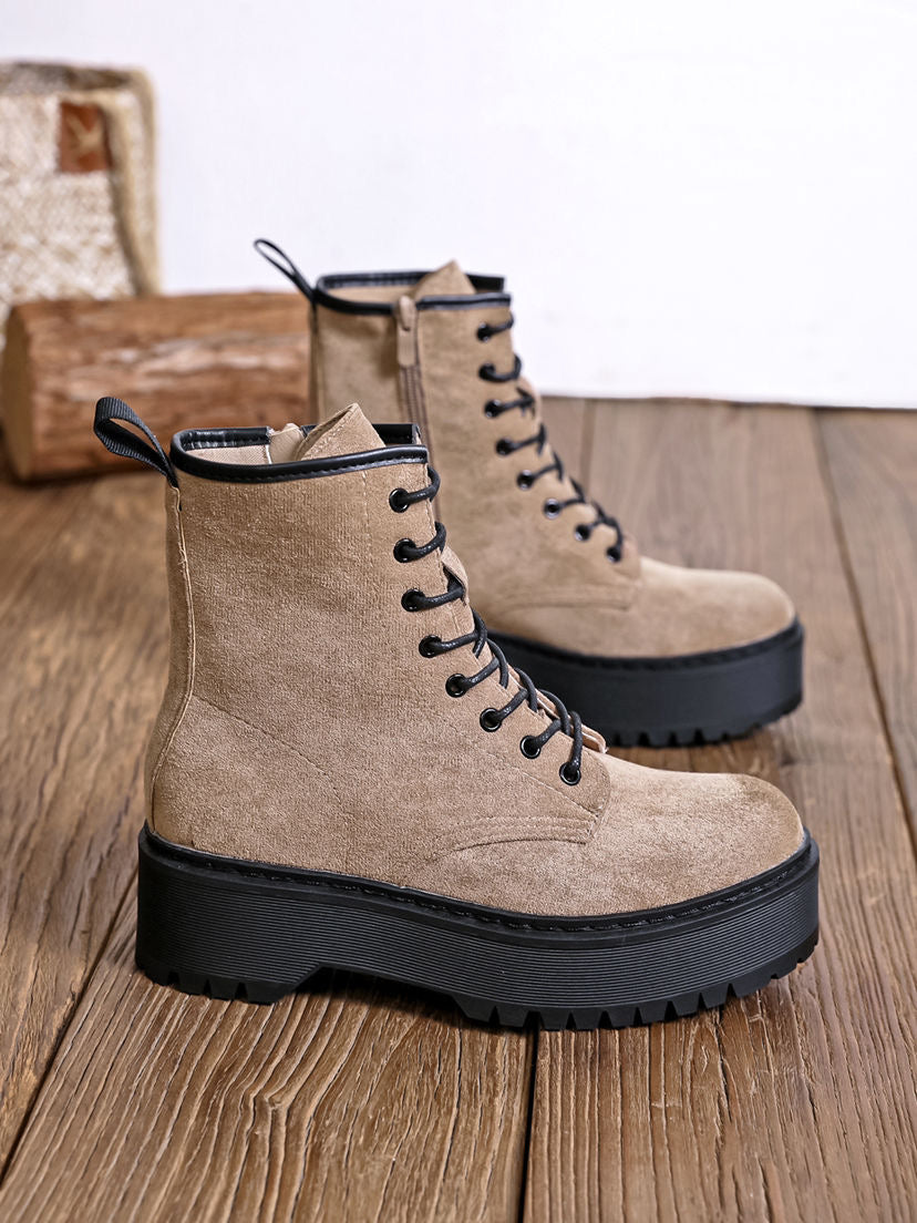 Ces bottines en suédine taupe avec semelle plateforme noire offrent une combinaison parfaite de confort et de style. La suédine douce dans une teinte taupe ajoute une touche élégante, tandis que la semelle noire assure stabilité et confort tout au long de la journée. Leur design simple et moderne les rend faciles à associer avec différentes tenues, idéales pour un look décontracté et chic.