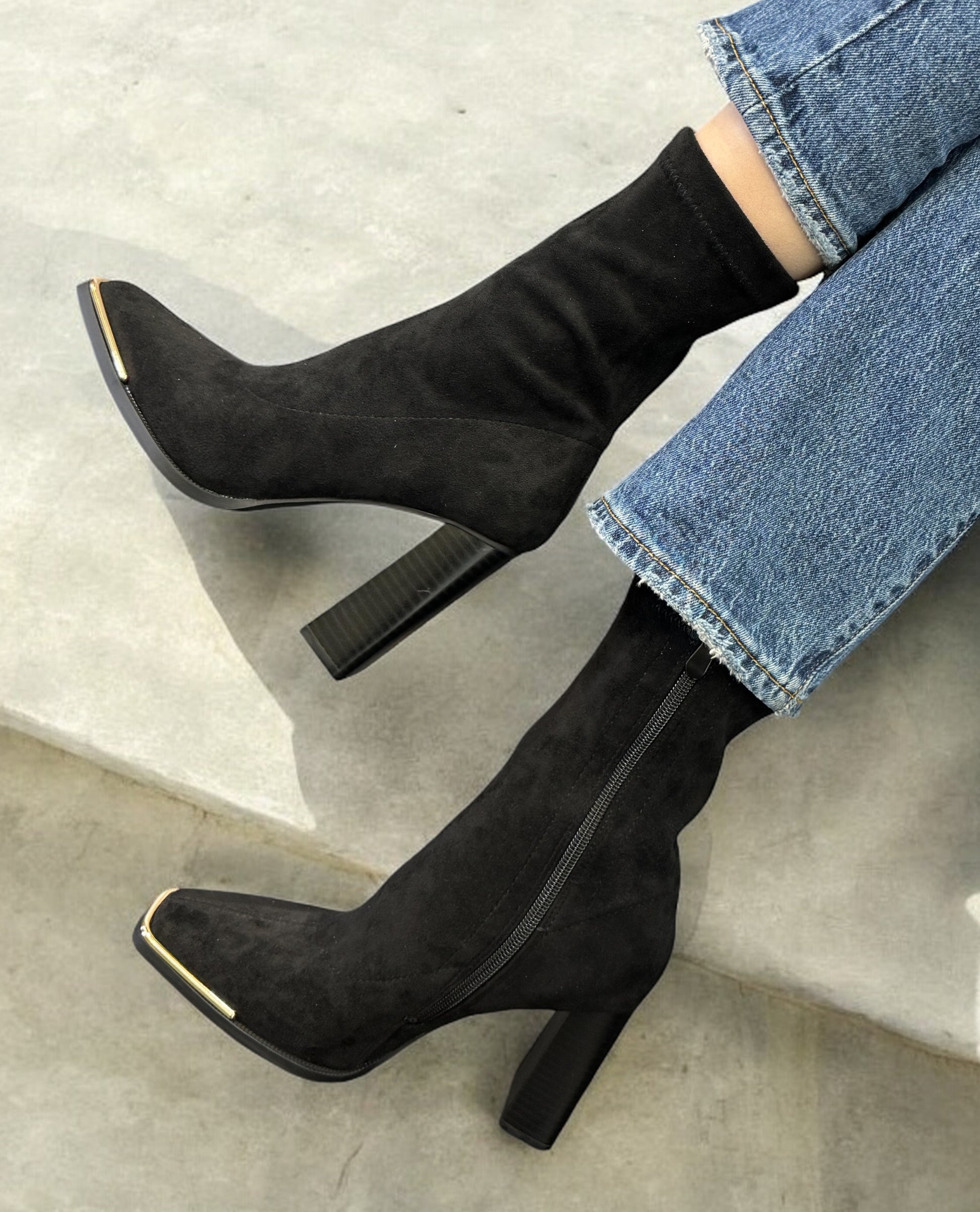 Les bottines noires à talons en suédine sont une paire de chaussures élégantes et raffinées, alliant confort et style. Fabriquées en suédine, un matériau doux et velouté qui imite le daim, elles offrent un look chic et intemporel tout en étant plus léger que le cuir. Le coloris noir permet une grande polyvalence, rendant ces bottines faciles à assortir avec une variété de tenues.