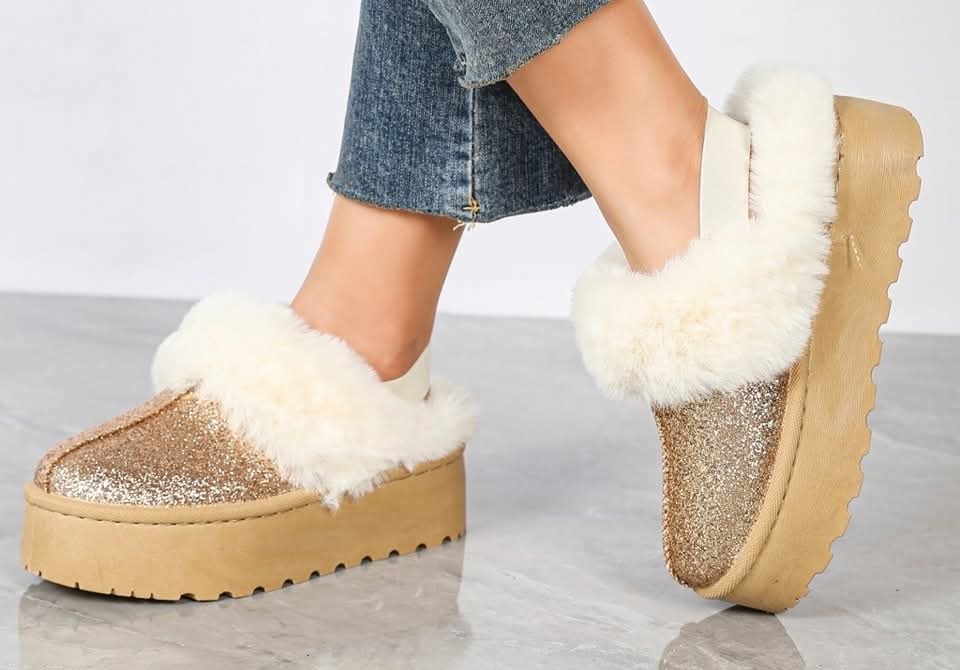 Mules pailletées à plateforme, idéales pour allier style et confort. Leur intérieur est fourré d'une matière douce et chaude, offrant une sensation de bien-être enveloppante, parfaite pour les journées fraîches. La semelle plateforme assure un look tendance tout en offrant un bon maintien. Un choix chic et cosy pour des pieds au chaud.