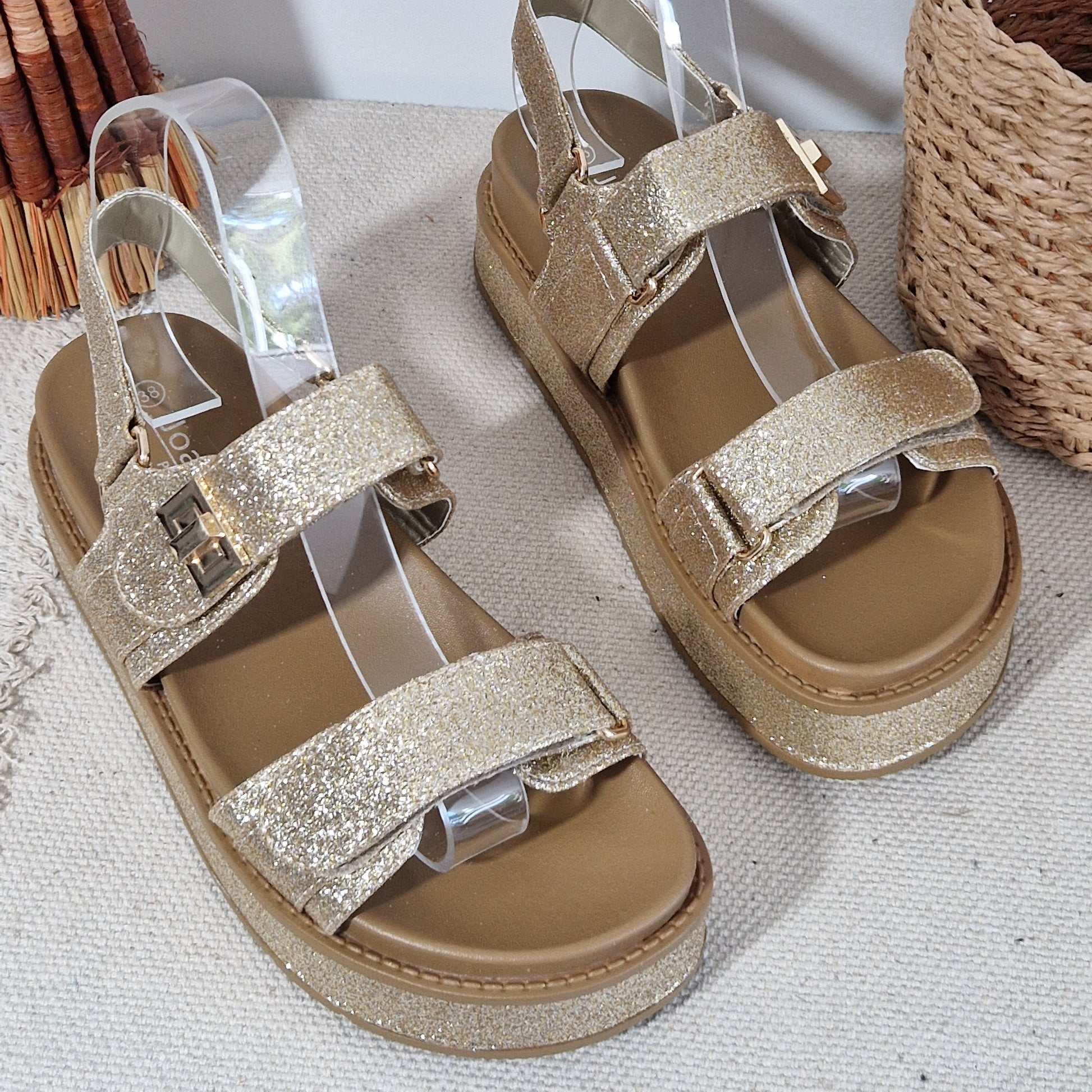 Ces sandales à plateforme dorée avec paillettes sont à la fois tendance et confortables, parfaites pour ajouter une touche de glamour à vos tenues estivales. La bride en scratch assure un maintien sécurisé et ajustable, permettant de les enfiler et de les enlever facilement.